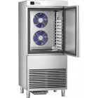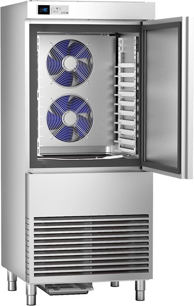 Abatitor, capacitate 12 tavi de dimensiunea 600x400x40mm, productivitate 45 kg in 90 minute de la +90°C la +3°C sau 28 kg in 240 minute de la +90°C la -18°C, comenzi electronice, structura inox AISI304, camera de racire cu colturi rotunjite, gaz refrigerant R290, izolatie din poliuretan- grosime 75mm, picioare inox ajustabile in inaltime, dimensiuni 800x930x1860(h) mm, alimentare 400V, putere 1.9 kW