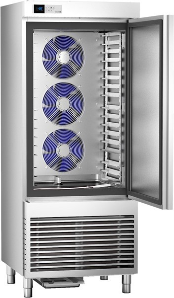Abatitor, capacitate 17 tavi de dimensiunea 600x400x40mm, productivitate 70 kg in 90 minute de la +90°C la +3°C sau 38 kg in 240 minute de la +90°C la -18°C, comenzi electronice, structura inox AISI304, camera de racire cu colturi rotunjite, gaz refrigerant R290, izolatie din poliuretan- grosime 75mm, picioare inox ajustabile in inaltime, dimensiuni 800x930x2000 (h) mm, alimentare 400V, putere 2.5 kW