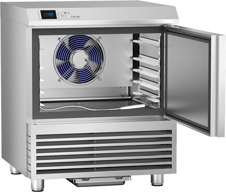 Abatitor, capacitate 6 tavi de dimensiunea 600x400x40mm, productivitate 20 kg in 90 minute de la +90°C la +3°C sau 12 kg in 240 minute de la +90°C la -18°C, comenzi electronice, structura inox AISI304, camera de racire cu colturi rotunjite, gaz refrigerant R290, izolatie din poliuretan- grosime 55mm, picioare inox ajustabile in inaltime, dimensiuni 747x725x900 (h) mm, alimentare 230V, putere 820W