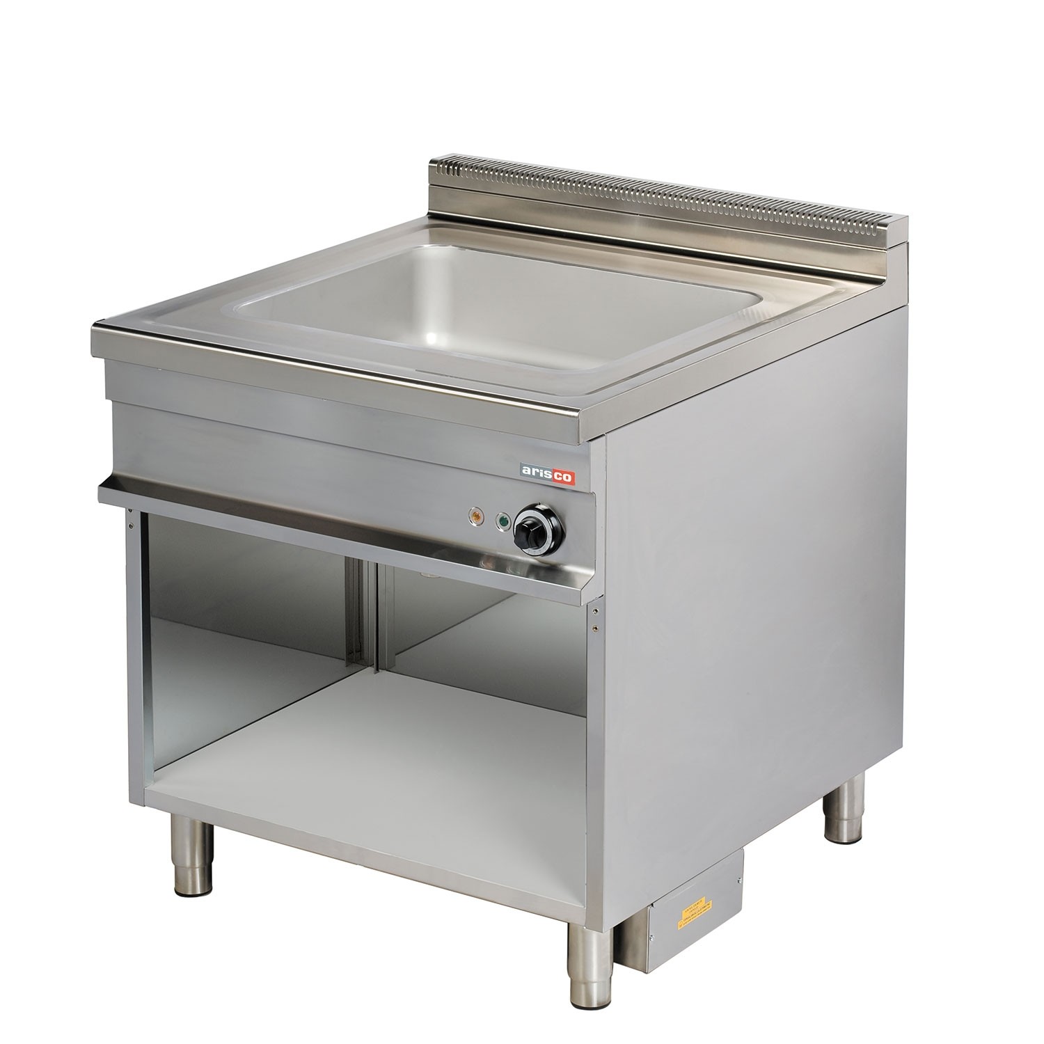 Bain marie electric, cu bazin GN2/1, capacitate 84 litri, suport deschis, control cu termostat, structura inox, dimesiuni: 850x900x900h mm, greutate 75kg, alimentare 220V, putere 4kW