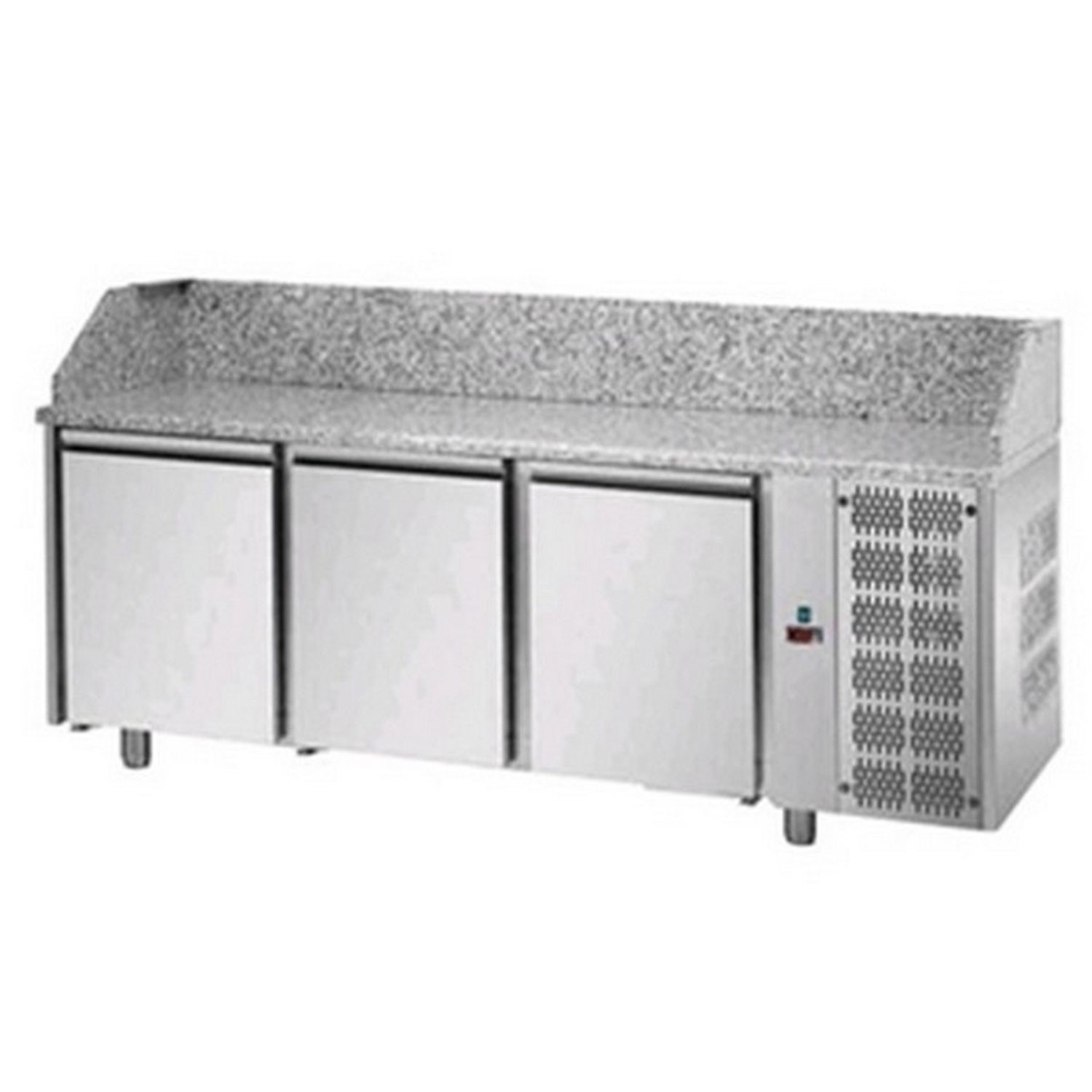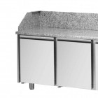 Banc de pizza, cu 3 usi, temperatura de lucru 0°C - +10°C, interior/exterior inox, izolatie din poliuretan, panou frontal de comanda, refrigerare ventilata, decongelare si evaporare automata a apei de condens, plan de lucru din granit, dimensiune (LxlxH mm): 2160x800x1030/1100 fara vitrina de ingrediente (cod TED-VR4215VD)
