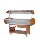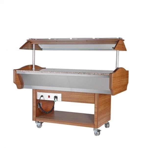 Bufet neutru cu cupola, culoare walnut, constructie inox, panouri laterale din lemn, plan de lucru din inox, 4 roti pivotante dintre care doua cu posibilitate de blocare, dimensiune (LxlxH mm): 1505x900x870/1320, alimentare 220V, greutate 240 kg