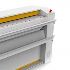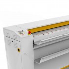 Calandru cu uscare, electric, lungime cilindru: 2100mm, diametru cilindru 325mm, cilindru polisat, benzi de calcare cu nomex rezistente pana la temperatura de 200grC, control electronic al temperaturii, viteza variabila de calcare: 1.6-5m/min, productivitate orara: 56kg, dimensiuni: 2640x550x1100h mm, greutate 490kg, alimentare 380V, putere 23400W