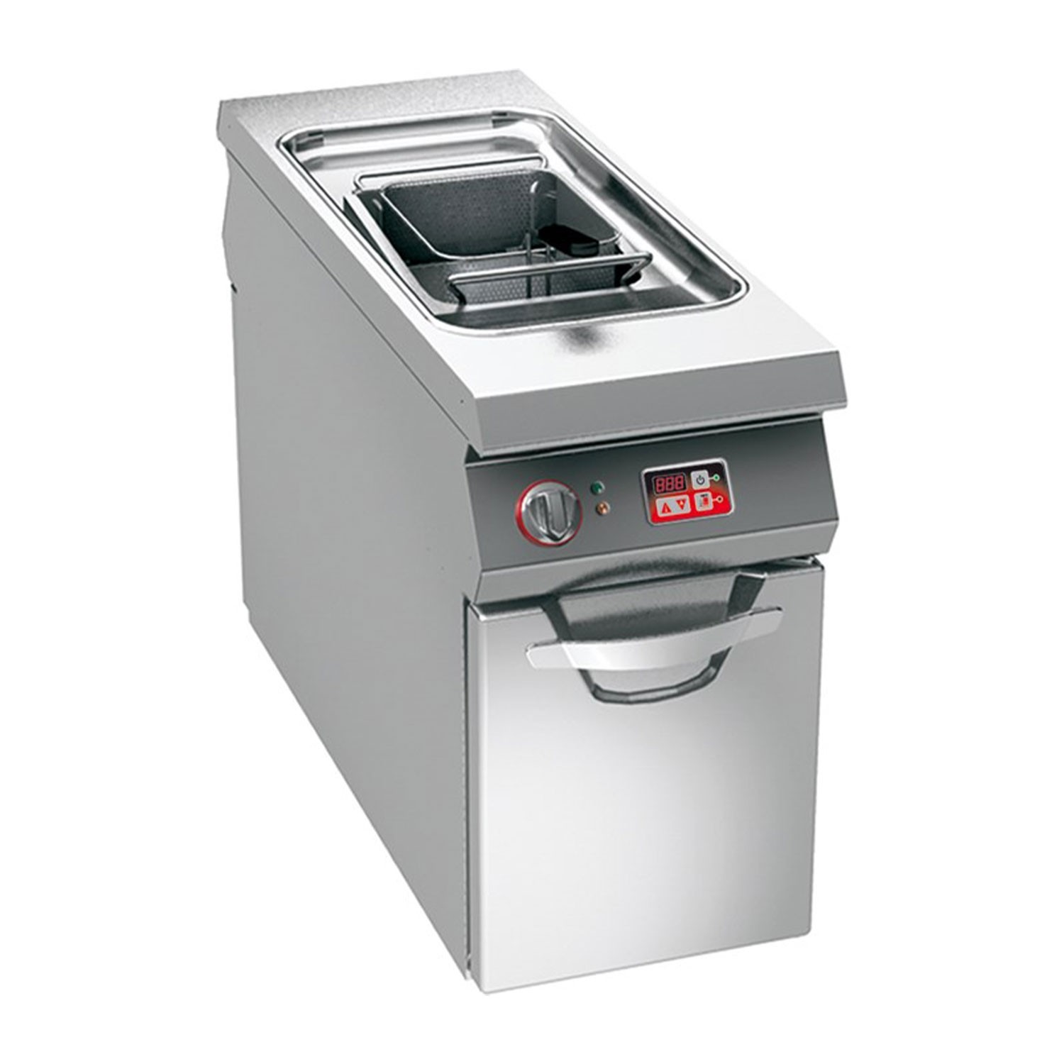 Friteuza electrica, cu o cuva, capacitate 9 litri, comenzi digitale, structura inox 18-10, grosime 2mm, suport inchis cu acces pe ambele parti, temperatura controlata electronic, afisaj electronic, robinet pentru descarcarea cuvei, temperatura de lucru pana la +190grC cu precizie +/-1grC,termostat de siguranta, dimensiune (LxlxH mm): 400x1100x720, alimentare 380V, putere instalata: 7,3kW