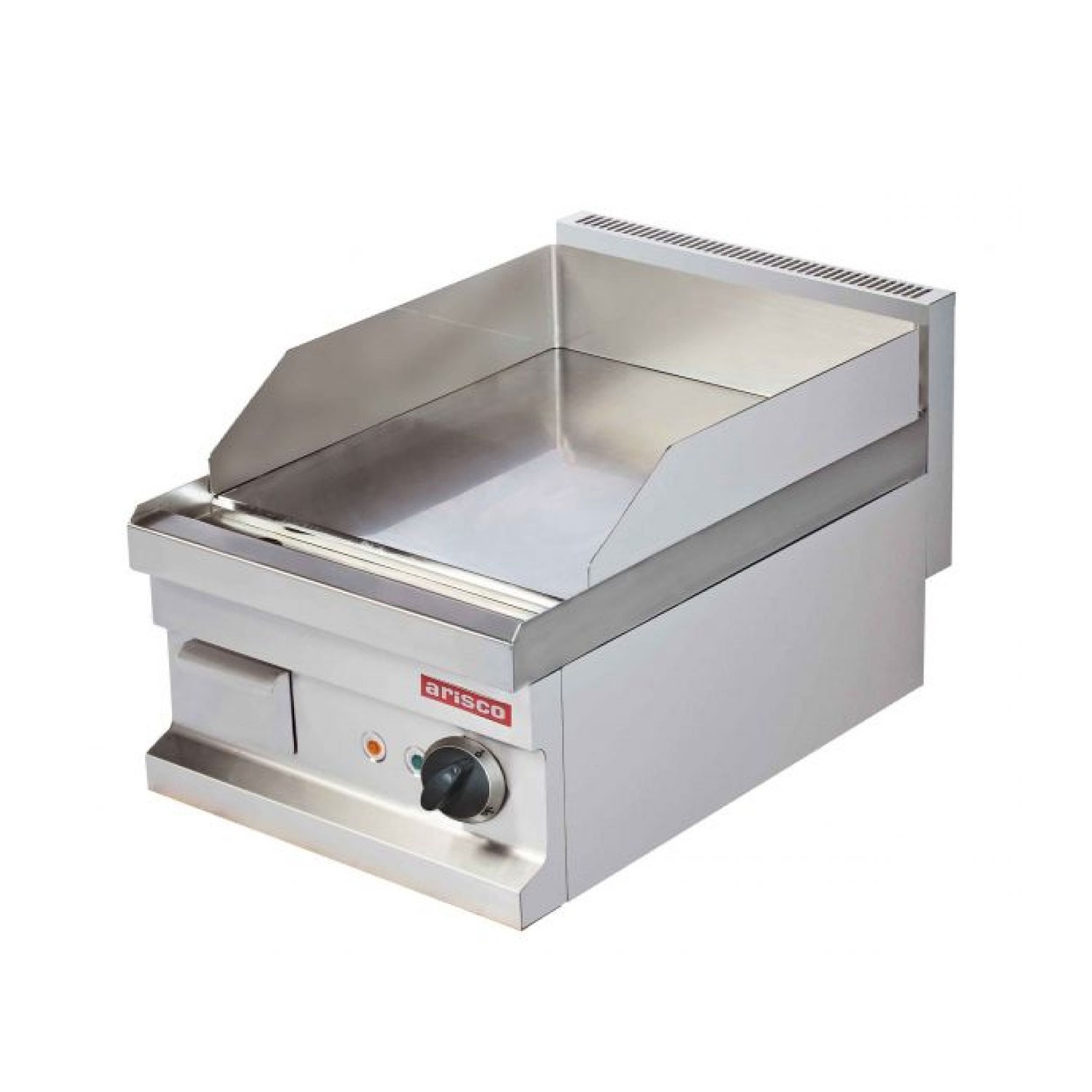 Fry top neted, electric, model de banc, structura de inox, control cu termostat, posibilitate schimbare recipient pentru grasime, dimensiuni: 400x600x265h mm, greutate 32 kg, alimentare 380V, putere 4050W