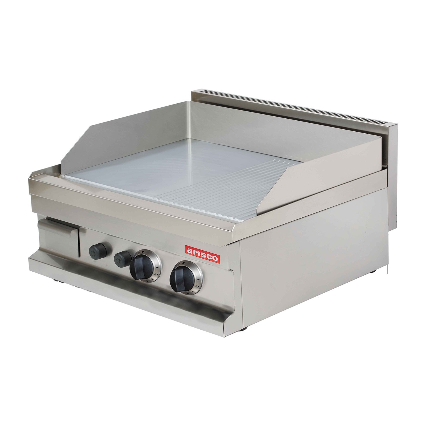 Fry top neted, alimentare gaz, structura de inox, posibilitate schimbare recipient pentru grasime, model de banc, dimensiuni:600x600x265h mm, greutate 66 kg, putere 2x4800 W