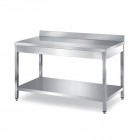 Masa, cu o polita, si inaltator la perete, cu plan de lucru ranforsat cu blat din PAL, picioare reglabile, inox, dimensiune (LxlxH mm): 3000x700x850