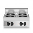 Masina de gatit, electrica, 4 plite rotunde, model de banc, butoane din polimer termorezistent de culoare neagra, plan din inox AISI304 cu grosime 10/10mm, dimensiuni 700x650x300hmm, putere electrica totala 10400W, alimentare 380V, greutate 29kg