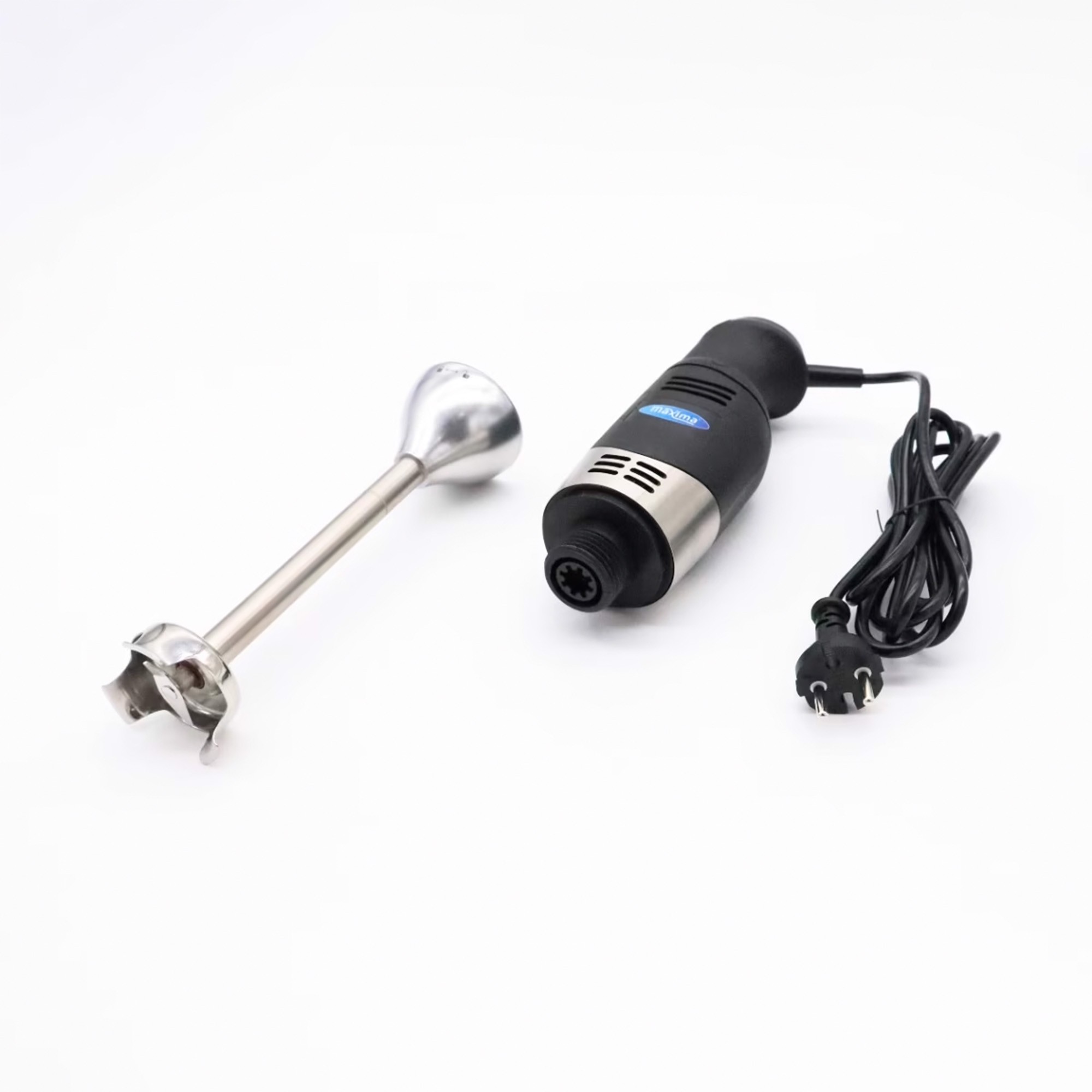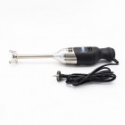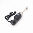 Blenderul are o tija din otel inoxidabil si aluminiu cu lame ascutite. O linie pe tija indica adancimea de introducere de 15 cm. Este important sa nu introduceti tija mai adanc decat linia, altfel alimentele pot intra in motor si provoca un scurtcircuit. Puteti insuruba usor tija pe maner.