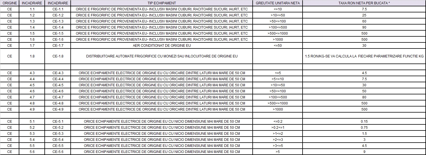 Pentru Produsele alimentate electric, in baza OUG 5/2015 privind deşeurile de echipamente electrice şi electronice (DEEE), publicată în Monitorul Oficial, Partea I, nr. 253 din 16.04.2015, Producatorii si distribuitorii sunt obligati sa informeze cumparatorii, in momentul vanzarii de EEE, cu privire la costurile colectarii, tratarii si eliminarii in conditii de protectie a mediului, prin evidentierea separata a acestor costuri.