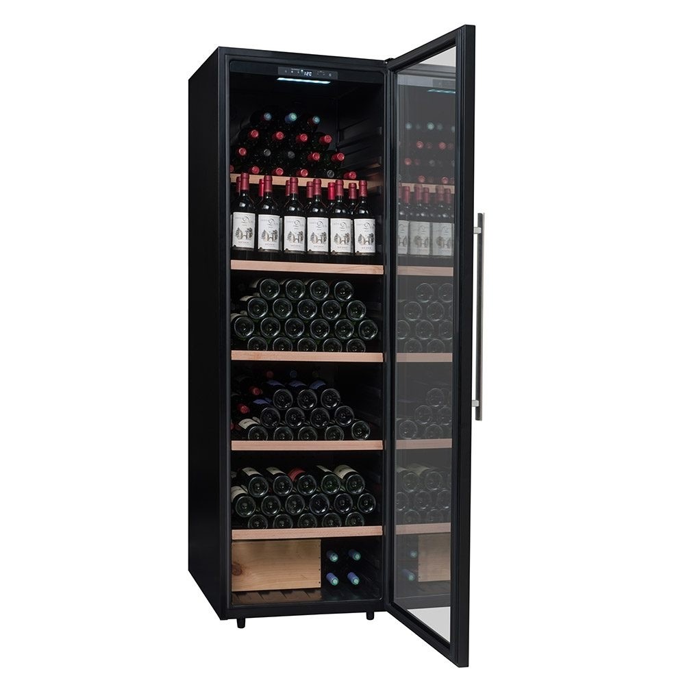 Vitrina pentru expunere sticle vin, capacitate 220 sticle, compresor, 1 zona / multi-temperatura, control electronic, iluminare interior LED, 5 rafturi metalice, fata lemn, dimensiuni 630x670x1945hmm