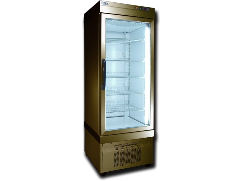 Vitrina verticala pentru produse refrigerate, capacitate 380lt, temperatura de lucru -25°C/+5°C, culoare aurie, refrigerare ventilata, expunere pe o latura, plan fix, dimensiune (Lxlxh mm): 670x640x1930, greutate 122kg, putere 500W