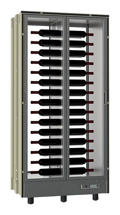 capacitate 120 sticle, asezate orizontal, prindere pe gatul sticlei, deschidere doar pe partea din fata, iluminata cu LED, temperatura de lucru +2°C-+16°C, dimensiuni 900x510x1898 h mm, putere 360W, alimentare 220V