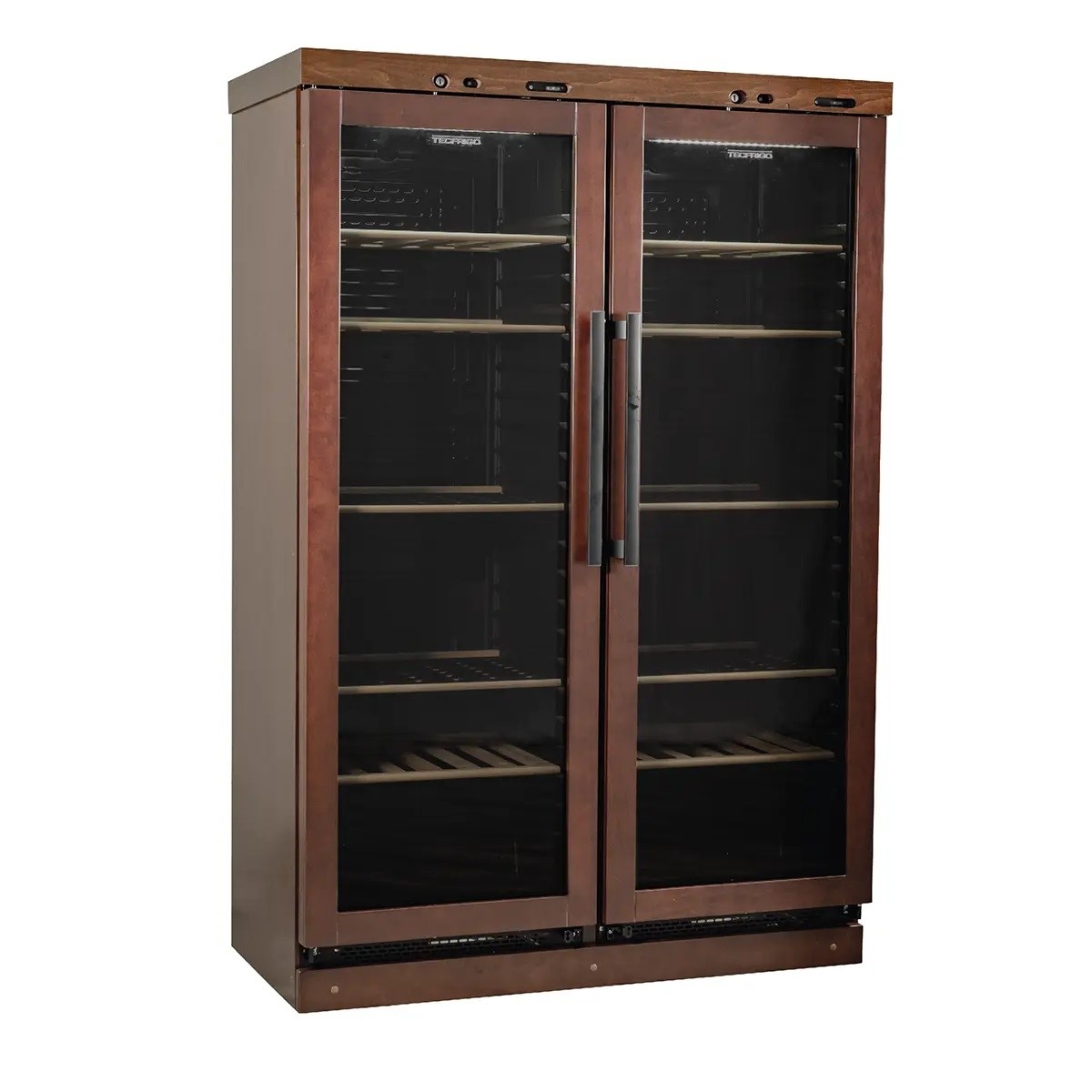 Vitrina verticala pentru vinuri, volum 355+355 litri, temperatura de lucru in intervalul +6/+16 °C - la temperatura ambientala de maxim +30 °C (gama produse: spumant/vin alb/vin roze/vin rosu), refrigerare statica, 10 polite din lemn pentru depozitare, termometru mecanic pentru afisarea temperaturii, iluminare tip LED, agent frigorific tip R600a, inchidere cu cheie, dimensiuni externe 1325x650x1880h mm, greutate 185kg, putere 250W , alimentare 220V